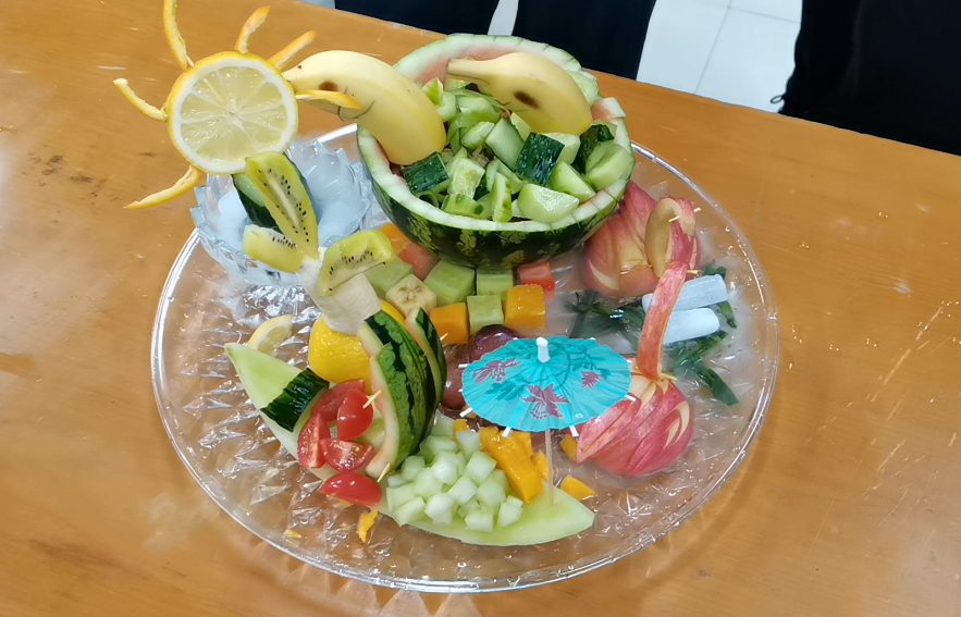 此次水果拼盘大赛共进行了两个回合的比拼,分别以“知否,是否,应是绿肥红瘦”以及“清凉一夏”为主题进行水果拼盘的制作。参与的七组同学使出了浑身解数,让美味的水果拼盘变成了一场视觉盛宴。