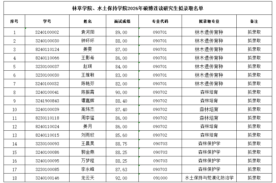 根据《林草学院、水土保持学院2026年硕博连读研究生招生实施方案》要求,经考生个人申请、量化评分、综合考核、择优录取。现将硕博连读研究生拟录取人员名单公示如下: