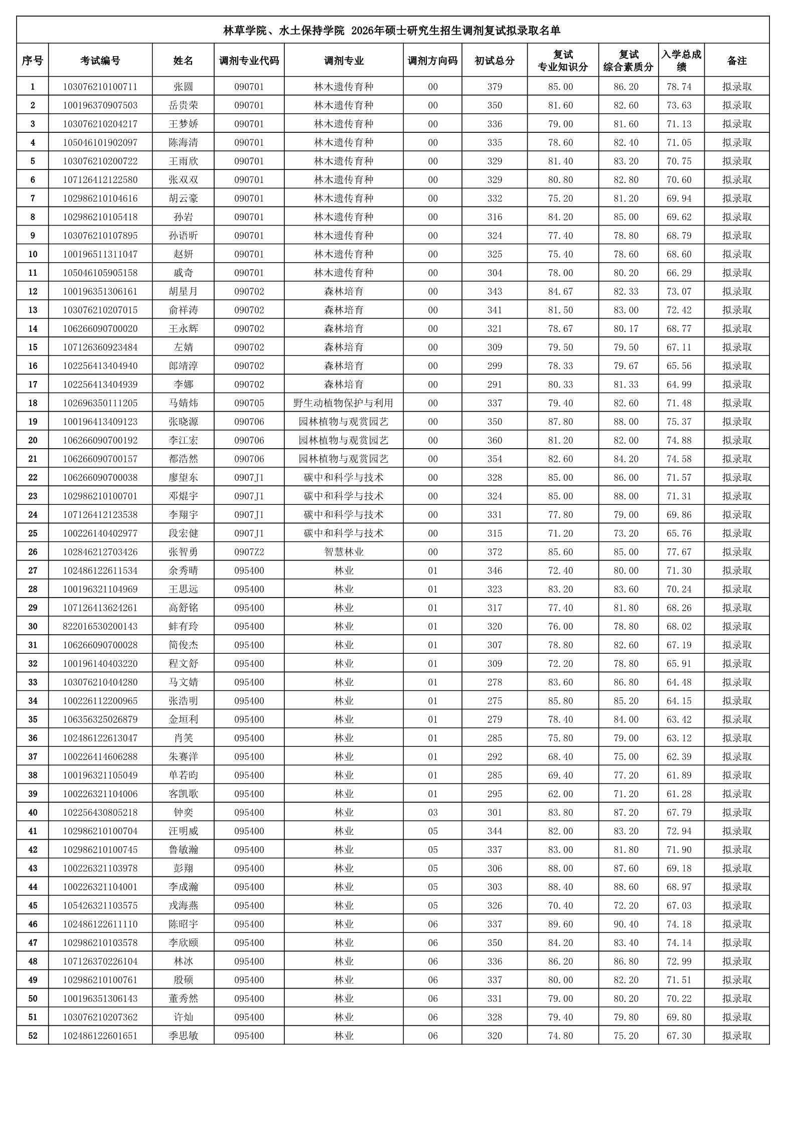 根据《林草学院、水土保持学院 2026年硕士研究生招生复试和录取工作实施细则》、《林草学院、水土保持学院 2026年硕士研究生招生接受调剂公告》等文件要求及相关工作安排,经过学院复试、初审,研究生院审核,确定2026年林草学院、水土保持学院硕士研究生调剂拟录取名单,现将拟录取名单予以公示。