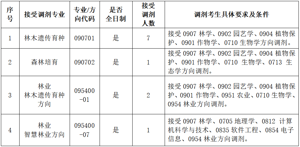 根据教育部、江苏省教育厅及南京林业大学2026年研究生招生工作相关文件精神,结合招生实际,我院全日制“林木遗传育种”(专业代码:090701)、“森林培育”(专业代码:090702)、“林业-林木遗传育种方向”(专业代码:095400,方向码:01)、“林业-智慧林业方向”(专业代码:095400,方向码:07)专业可接受调剂考生。现将接受调剂公告如下: