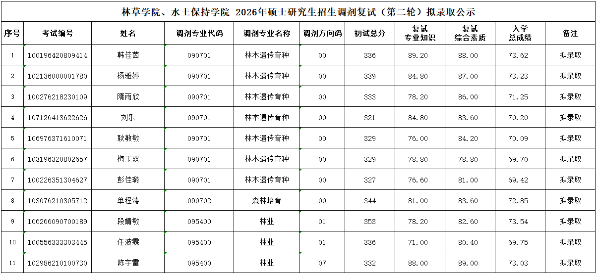 根据《林草学院、水土保持学院 2026年硕士研究生招生复试和录取工作实施细则》、《林草学院、水土保持学院 2026年硕士研究生招生接受调剂公告及复试须知(第二轮)》等文件要求及相关工作安排,经过学院复试、初审,研究生院审核,确定2026年林草学院、水土保持学院硕士研究生调剂(第二轮)拟录取名单,现将拟录取名单予以公示。
