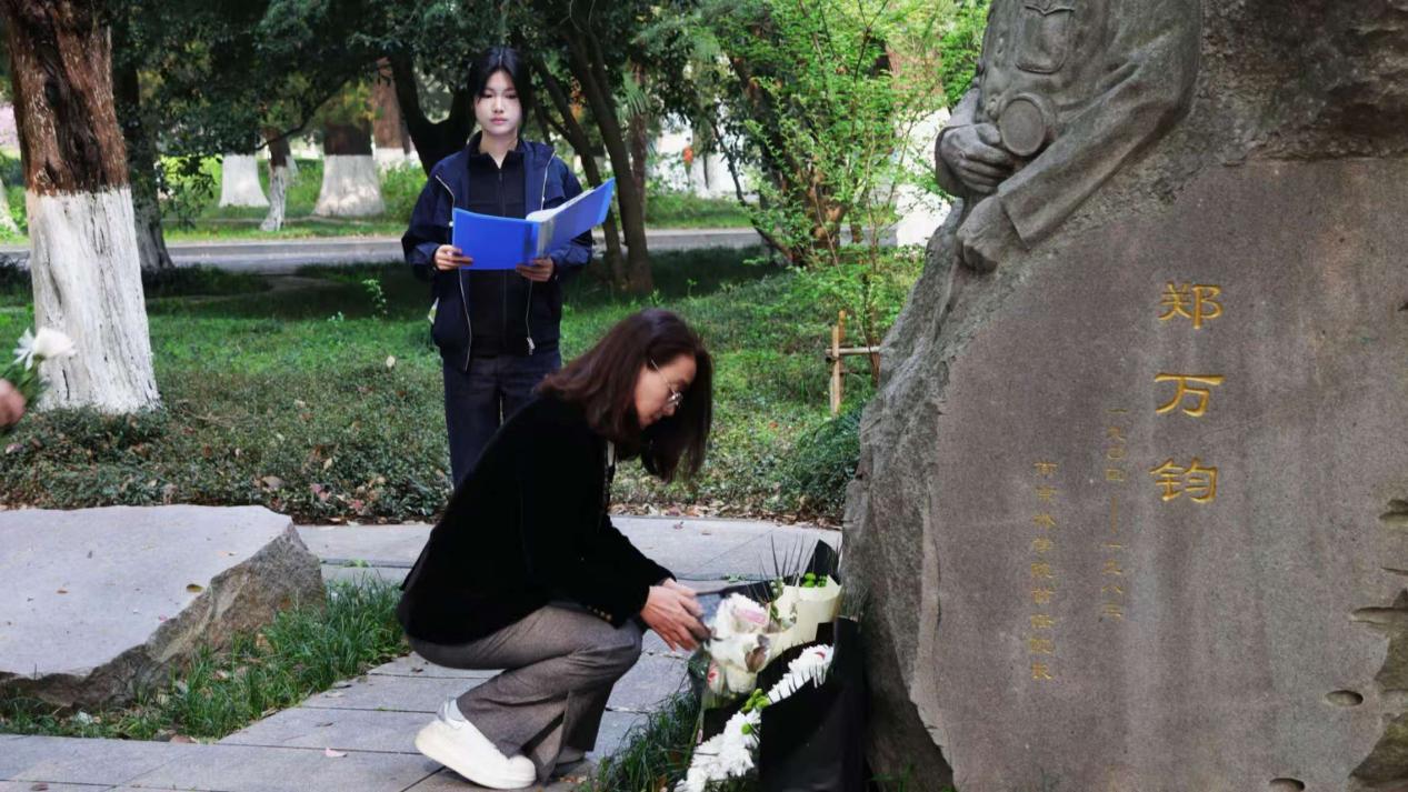 春日晨光中,郑万钧院士雕像巍然矗立。"碧水青山"传习社代表黄家琪深情追忆郑万钧院士毕生献身林业科研、推动水杉发现与研究的卓越功绩,带领在场师生重温先贤扎根山野、严谨治学的报国情怀。随后,师生们手持素菊,依次敬献于雕像前,鞠躬致敬,朴素而庄重。
